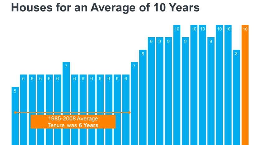 Today, homeowners are living in their houses longer. According to the National Association of Realtors (NAR), since 1985, the average time a homeowner has owned their home has increased from 5 to 10 years (see graph below):